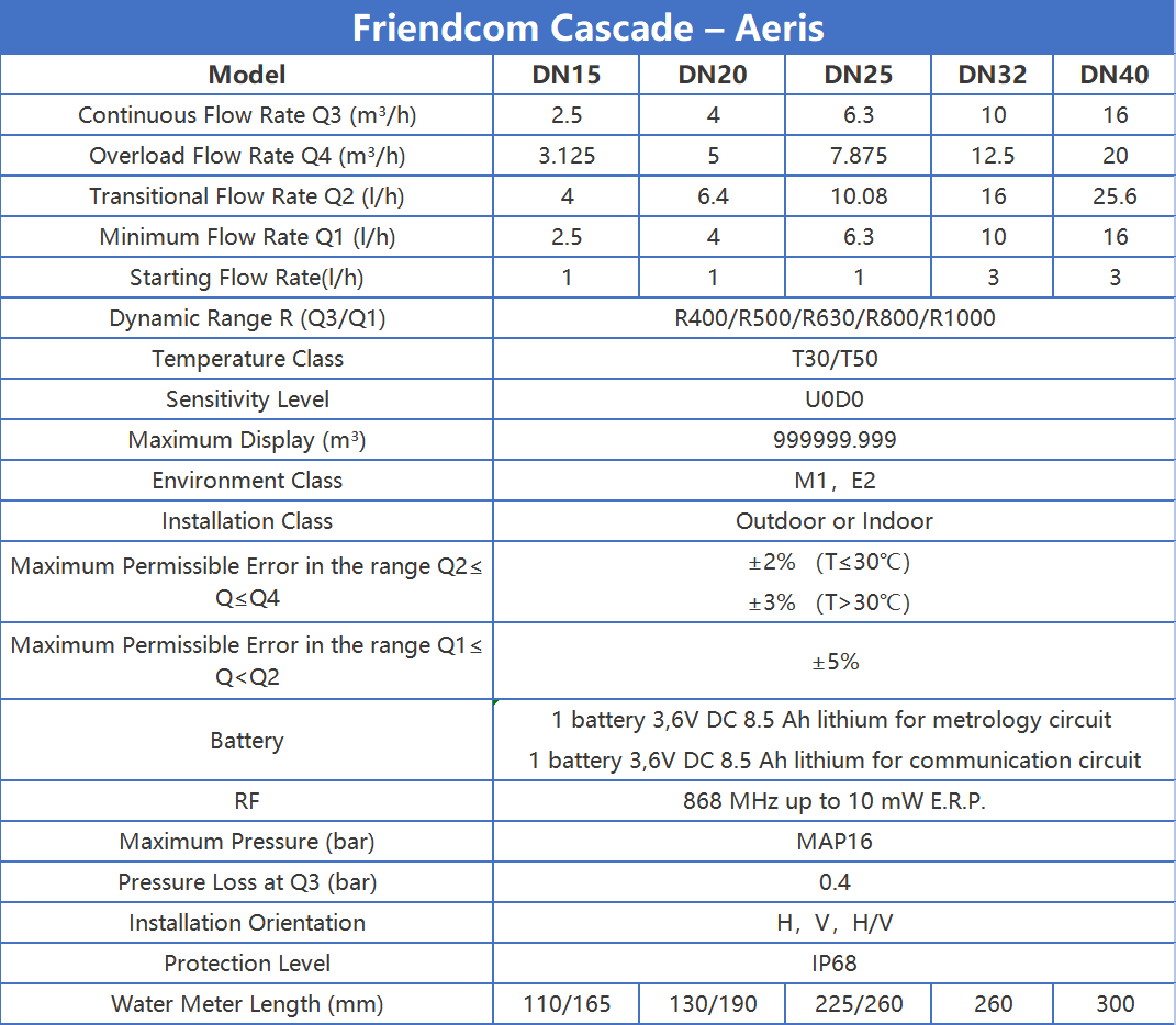 Friendcom Cascade-Aeris, a ultrasonic water meter with the unique patented design. Friendcom offers a complete ultrasonic water meter solution, with a range ratio up to R1000. The water meter is rated at IP68 and with a high resis-tance to hydraulic shock and magnetic interference. It has brass or stainless steel pipe to adapt to different installation environment.